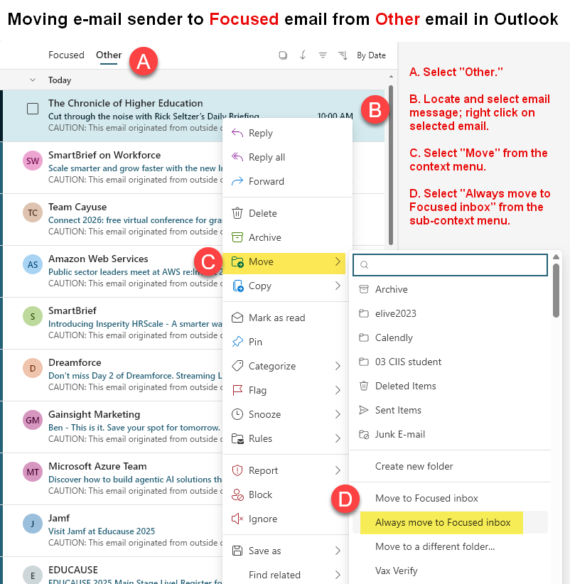 Email sometimes gets “stuck” in the Other inbox in Outlook. This can happen for a number of reasons – mainly if you regularly receive email from that sender without opening it. Please see the below graphic to move email from a specific sender into the Focused inbox.
